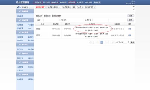 会员详细健康记录查询 (让机构清楚地知道客户的体质情况、生活习惯、体征信息、以及历史健康建议等)便于推送个性化的精准服务产品。客户也会觉得您很用心!!!